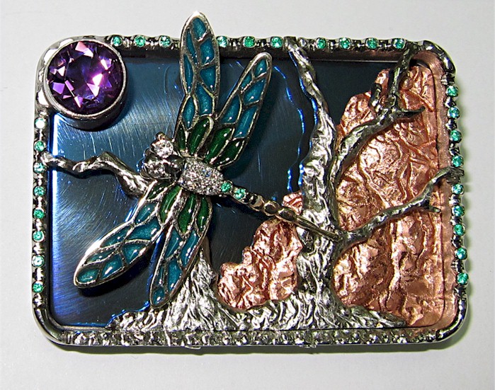 steel titanium, silver, gold, glass diamonds and emeralds. I sourced the rough Amethyst from