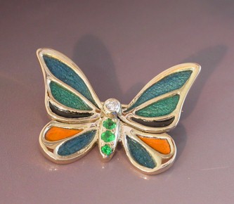 This enamel butterfly brooch has been made using the cloisonné