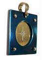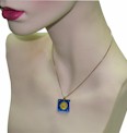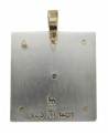 This is a square pendant with blue titanium in which there is a circle that is silver vermeil - describing the method of gold-plating silver. In the centre is a star set diamond and four rivet beads on each corner. A 2mm chain or cord will fit through this awl. The picture of the model wearing this square shaped diamond necklace demonstrates the size of this pendant. On the back of this designer pendant you will find four stamps - the artist Hans Meevis signature,  ti for titanium, 14ct and silver.
