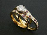 18ct Yellow Gold Inter-locking Ring set with Diamonds and Amethyst Commissioned -