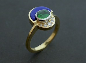 18ct Yellow gold ring set with an oval 0.91ct Tsavorite tube set in white gold, hand-carved Lapis Lazuli and 0.12 pavé set diamonds -