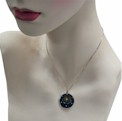 This is a circle pendant with blue titanium in which there is a circle that is silver vermeil - describing the method of gold plated silver. In the centre is a star set diamond and 14ct gold rivet beads in the blue circle. A 2mm chain or cord will fit through this awl. The picture of the model wearing this titanium necklace demonstrates the size of this pendant. On the back of this designer pendant you will find four stamps - the artist Hans Meevis signature, ti for titanium, 14ct and silver.