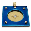 This is a square pendant with blue titanium in which there is a circle that is silver vermeil - describing the method of gold-plating silver. In the centre is a star set diamond and four rivet beads on each corner. A 2mm chain or cord will fit through this awl. The picture of the model wearing this square shaped diamond necklace demonstrates the size of this pendant. On the back of this designer pendant you will find four stamps - the artist Hans Meevis signature,  ti for titanium, 14ct and silver.